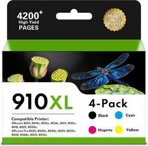 910XL High Yield Ink Cartridges Combo Pack (Black/Cyan/Magenta/Yellow 4-Pack) Compatible for HP 910XL HP910 HP910XL Replacement for Office Jet Pro 8020 8025 8028 8010 OfficeJet 8015 8022 Printers