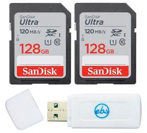 SanDisk 128GB SDXC SD Ultra Memory Card (Two Pack) Works with Canon EOS Rebel T7, Rebel T6, 77D Digital Camera Class 10 (SDSDUN4-128G-GN6IN) Bundle with (1) Everything But Stromboli Combo Card Reader