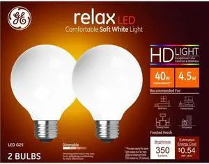 (2 bulbs) GE 31541 relax LED, G25 LED globe, 4.5 watt, Dimmable, medium base, 40 watt equivalent, soft white