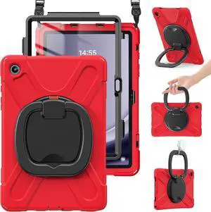 Case for Sam-sung Galaxy Tab A9+ Plus 11\u201d 2023 SM-X210/X216/X218-Heavy Duty Rugged Silicone Cover with Screen Protector, 360 Degree Rotating Stand, Stable Kickstand, Shoulder Strap, Colorful Red