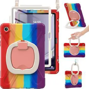 Vszerda Rugged Case for Sam-sung Galaxy Tab S10 Lite/S10 FE 2025 & S9 FE/S9/S8/S7 10.9"/11" | Protective Silicone Cover with 360°Swivel Handle/Kickstand, Shoulder Strap & S Pen Holder, Colorful Red