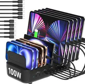 SooPii Multi USB Charging Station,100W 10-Port Type C Fast lPad Charging Station for Multiple Devices with 10 Cables and Adjustable Dividers, Compatible with Phone, Tablet,Kindle and More(Black)