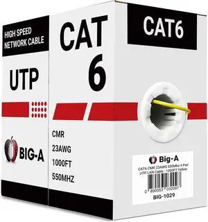 Big-A - Bulk Cat6 Cable 1000ft 23AWG Solid 4 Pair, Cat 6 Ethernet Cable Unshielded Twisted Pair (UTP), (CMR) 550MHz Internet Cable, Pull Box - White