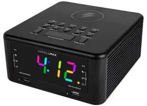 HANNLOMAX HX-206Wi Alarm Clock Radio with Wireless Charger, RGB Color Display, USB Port for Charging and MP3 Playback, Bluetooth, Soothing Sleep Sounds, Aux-in, AC Operation only. (Black)