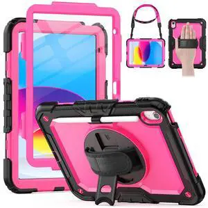HXCASEAC Case for iPad A16, iPad 11th 10th Generation Case for Kids 10.9 11 inch, Drop Proof, Screen Protector, Pencil Holder, Rotating Stand, Hand Strap (A2969/A2757/A3354/A3355) 10.86 inch, Rose