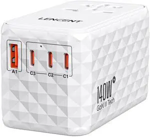 LENCENT 140W International Travel Adapter, GaN Universal Travel Adapter with 1 USB-A & 3 Type C Power Adapter, Fast Charger for Phone,Laptops, Worldwide Plug Adapter for USA/UK/EU/AUS, White