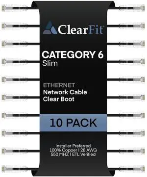 Slim 10 Pack - 10ft Cat6 28AWG Ethernet Patch Cable, Network, Clear Boot, Cat 6 Internet, Data Center Rated, Black, 10 Foot, by UNC Group