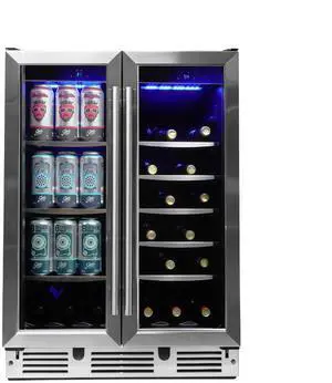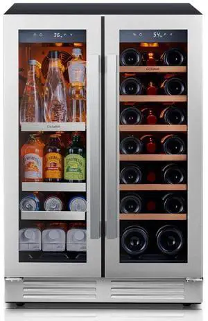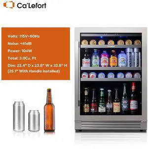 This stylish French door beverage center will keep your drinks cool and refreshing while being whisper quiet at 42dB. The fridge offers a generous 5.1 cubic feet (123 liters) of cooling and storage space and can hold up to 27 standard 750 ml bottles of wine and up to 60 12 oz. cans. Featuring 3 extendable spotless steel-trimmed glass shelves, digital capacitive touch temperature controls, and powerful interior LED lighting, every beverage lover will be impressed. This reversible model allows you to adjust the door swing for either left or right-handed opening. This beverage center also features a towel bar door handle and comes with a 12-mo...