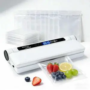 Food Vacuum Sealer Machine, 75KPA Strong Suction, Dry/Wet Modes, 20 Bags Included, Digital Countdown Timer, LED Indicator, Compact Design for Home Kitchen and Food Storage