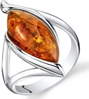 Baltic Amber Elliptical Ring Sterling Silver Cognac Color Marquise Shape, Sizes 5 through 9