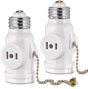 2-Pack E26 Light Socket Adapter - Converts Medium Screw Socket to Two Outlets With Pull Chain Switch - UL Listed, White