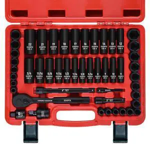 3/8" Drive Impact Socket Set, 50 Piece Standard SAE (5/16 to 3/4 inch) and Metric (8-22mm) 6 Point, Extension Bars, Impact Universal Joint, Adapter, Cr-V Steel