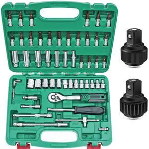50-Piece 3/8" Drive Socket Set, SAE (5/16"-3/4") & Metric (8mm-22mm), Deep & Shallow, 72-Tooth Ratchet Wrench, Extension Bars, 1/2" F to 3/8" M Reducer, Universal Joint & Power Drill Adapter