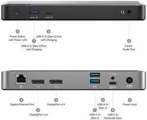 Ports Spec: 4 x SuperSpeed USB 3.0 - 9 pin USB Type A ¦ 2 x audio / video - DisplayPort - 20 pin DisplayPort ¦ 1 x network - Ethernet - RJ-45 ¦ 1 x display / video - VGA - 15 pin D-Sub (DB-15) ¦ 1 x audio - line-in - mini-phone stereo 3.5 mm ¦ 1 x audio - line-out - mini-phone stereo 3.5 mm