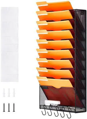 VEVOR File Wall Rack, One-Piece 10 Pockets Mesh Wall File Holder, Wall Mounted Magazine Mail Paper & Document Storage Folder, Metal Wall File Organizer with Nametag Label, for Office Home & School