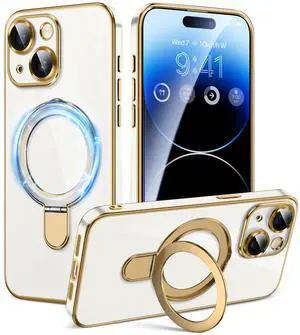 for Phone 13 Case with Magnetic Ring Stand,[Compatible with Magnetic][Full Camera Protection] Shockproof Protective Non-Slip Sturdy Kickstand Phone Case 6.1 inch, White