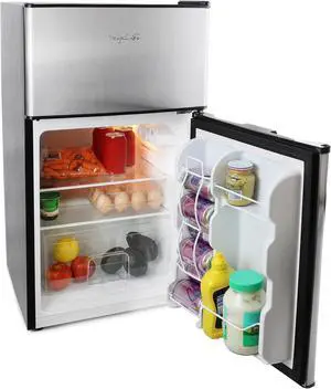 Specifications: This stylish compact all-refrigerator offers 3.2 cubic feet (91 liters) of refrigeration making it the ideal fit for lunchrooms, dormitories, smaller kitchens and wet bars. All of your favorite drinks can be kept cool with the tall bottle storage. There’s also plenty of room for all your snacks due to the units 2 full width and 1 half width glass shelves. The reversible door hinge allows users to choose to have the door open left or right-handed via the integrated door handle for any room set-up.