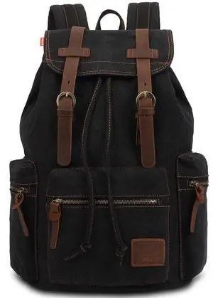 YOUNXSL Canvas Vintage Backpack PU Leather Casual Bookbag Men Women Laptop Travel Rucksack Black