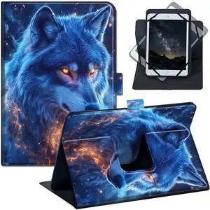 Universal 10 Inch Tablet Case, 10.1 Inch Tablet Case with 360 Rotating Stand, PU Leather Folio Cover, Compatible with Fire HD 10 2023, Galaxy Tab, iPad 9th/ 8th, Blue Wolf