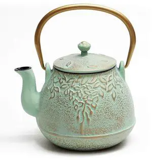 Japanese Teapot with Stainless Steel Infuser, Cast Iron Tea Kettle Stovetop Safe, Leaf Design Coated with Enameled Interior for 32 Ounce (950 ml), Light Green
