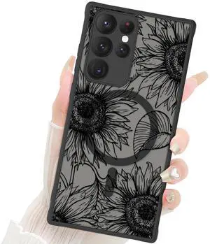 Fiyart Designed for Samsung Galaxy S22 Ultra Case Matte Flowers Design Compatible with MagSafe Wireless Charging,Cute Sunflowers Anti-Scratch Translucent Phone Cover for Women Girls 6.8"-Black