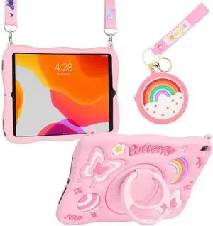 Beszeith Kids Silicone Case for iPad mini 7 (A17 Pro, 2024), iPad mini 6th Generation (8.3 inch, 2021) - Cute Butterfly Design with Adjustable Strap and Mini Wallet for Girls (Pink)