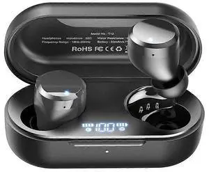 T12 Wireless Earbuds, Bluetooth 5.0, IPX8 Waterproof, Digital LED Display, 28H Playtime (Black)