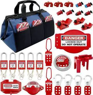 Lockout Tagout Kit - Clamp-On Circuit Breaker Lockout, Group Lockout Hasps, Lockout Tag, Universal Multi- Pole Breaker with Pocket Bag (Blue Bag kit)