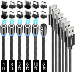 Magnetic Charging Cable 6-Pack [1ft/3ft/3ft/6ft/6ft/10ft], 3 in 1 Nylon Braided Magnetic Phone Charger, Compatible with Micro USB, Type C, iProduct and Most Devices