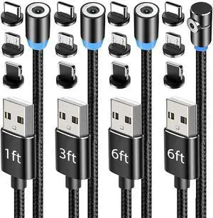 Magnetic Charging Cable 4-Pack [1ft/3ft/6ft/6ft], 360° Rotating Magnetic Phone Charger Cable with LED Light, 90° Angle Connector, Nylon-Braided Cords