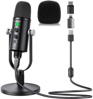 USB Microphone for iPhone, iPad, Android, PC & Laptop, Condenser Podcast Mic with Noise Reduction, Mute, Headphone Monitoring & Echo Control for ASMR, Podcast, Streaming, Gaming