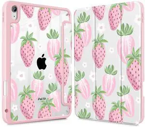 May Chen for iPad Air 11-inch M4/M3/M2 (2026/2025/2024), iPad Air 5th/4th 10.9 Inch - Shockproof Cover with Clear Back Shell & Penceil Holder Auto Wake/Sleep Stand Cover, Strawberries