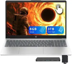 HP 15.6" FHD Touchscreen Laptop, AMD Ryzen 5 7520U, 8GB LPDDR5, 3TB Storage (2TB SSD+1TB Docking Station Set), AMD Radeon Graphics, Full-Size Keyboard, Copilot, Windows 11 Home, Silver