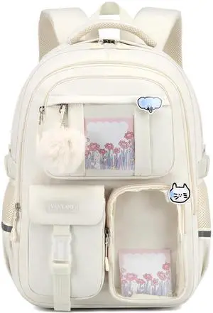 Backpack for Teen Girls, Cute Aesthetic School Backpacks with Accessories for Middle High School Students, Designer Backpack for Kids Bookbag, Beige