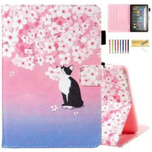 Dteck for Fire HD 8 (12th/10th Generation) Smart Folio Case 2024/2022/2020 Release (8") with Auto Sleep Wake/Stand/Adjustable Viewing Angle/Stylus, PU Leather Protective Cute Cover, Pink Cherry Cat