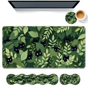 DHEEBFWE Keyboard Mouse Pad Set,Large Desk Pad+Keyboard Wrist Rest+Mouse Wrist Support+Coaster,Easy Typing Pain Relief Non-Slip Wrist Support Mousepad Set Home Office,Black Cats in The Leaves