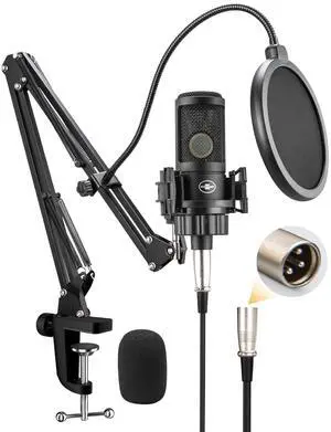XLR Podcast Microphone, Professional Cardioid Studio Condenser Microphone XLR with 26mm Large Diaphragm for Recording, Streaming, Gaming, ASMR, Computer PC Mic Kit with Boom Arm, Pop Filter