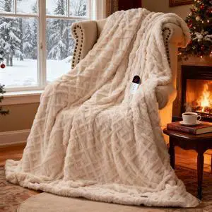 Heated Blanket Electric Throw with 6 Fast Heating Levels,4 Hours Auto-OffUltra Coza & Warm 50x60 Faux Rabbit Fur Electric Blanket with Overheating Protection,ETL Certification(Cream)