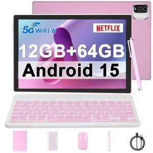 IWEGGO Android 15 Tablet, 10 inch 12GB RAM+64GB ROM/ 1TB Expansion, 1.8Ghz Quad-core Processor, 8MP Camera 6000mAh Battery, 1280*800 HD Touchscreen, 2 in 1 Tablets with Keyboard Case Mouse Stylus Pink
