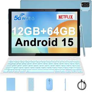 IWEGGO Android 15 Tablet, 10 inch 12GB RAM+64GB ROM+1TB Expandable, 1.8Ghz Quad-core Processor, 2 in 1 Tablets with Keyboard Case Mouse Stylus, 5G Wifi, 8MP Dual Camera, 1280*800 HD Screen Tablet Blue