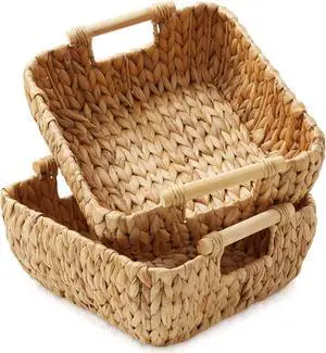 Casafield Set of 2 Water Hyacinth Oval Storage Baskets with Wooden Handles - Small, Woven Bin Organizers