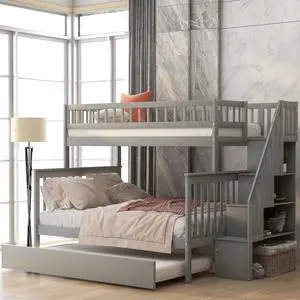 Twin over Full Bunk Bed with Trundle and Staircase,Gray