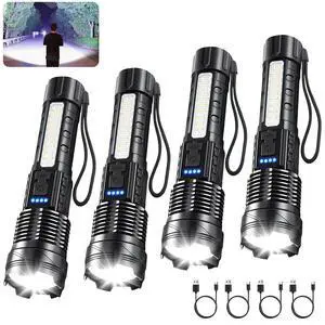 Specifications: High Lumens, Adjustable Light Modes, Adjustable Focus, Rechargeable, 9000 hours, lithium_ion, 4, 6.5 L x 1.65 W x 1.65 H inches, waterproof, 1 year manufacturer., ShineRover, A76 Flashlight Rechargeable-4P