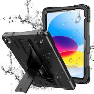 Hualele for iPad 10th Generation Case 10.9 inch Waterproof,Full Body Rugged Shockproof Dustproof Protective with Built-in Screen Protector,Elastic Hand Strap & Invisible Kickstand,Black