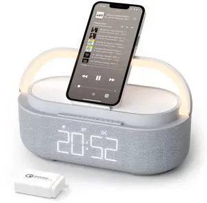 COLSUR Bluetooth Speaker Alarm Clock with Wireless Charger, FM Radio, Adjustable LED Night Light, 6 in 1 Bedroom Portable Speaker 2500mAh, Phone Stand for Bedside, Home, Office, Gift (Gray)