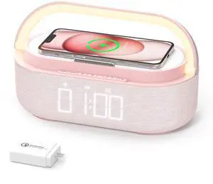 Bluetooth Speaker Alarm Clock with 10w Fast Wireless Charger for iPhone Samsung, 10W Stereo Bluetooth Speaker, 12-Color Night Light, White Noise Machine Digital Clock with FM Radio for Bedroom