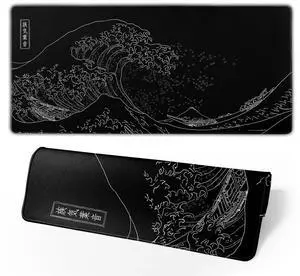 KEHIPI Japanese Gaming Mouse Pad Black Mouse Pad Kanagawa Large Mousepad Non-Slip Rubber Base Waterproof with Stitched Edges for Gaming Office Home, 31.5x11.8 Inch (Black Wave)