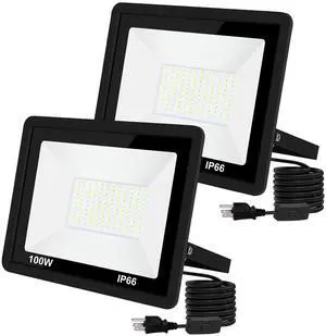 Flood Lights Outdoor with Plug,100W 10000LM Super Bright LED Work Light,IP66 Waterproof Security Light,Outside Floodlight for Garage,2 Pack