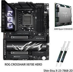 ASUS ROG CROSSHAIR X870E HERO Motherboard & AMD Ryzen 9 9950X3D CPU Combo, AMD AM5 ATX motherboard, Advanced AI PC ready, 18+2+2 power stages, DDR5, PCIe 5.0, 5x M.2, Wi-Fi 7, USB4