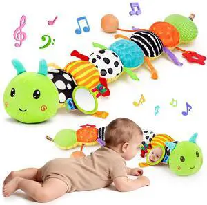 Baby Sensory Toy 0-6 Month Music Animal Stuffed Plush Caterpillar Toy for Infant 0-3-6-12 Month Old Tummy Time with Mirror Crinkle Rattle Toys for Newborn Boys Girl Shower Gifts Easter Basket Stuffer
